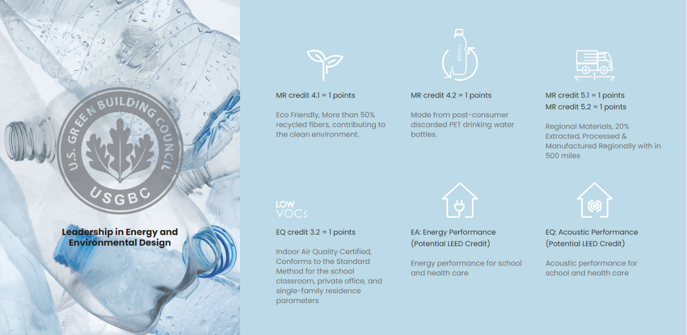 Feltech’s acoustic sound and thermal insulation products use up to 85% recycled content. This surpasses the USGBC LEED MR credit 4.1 & 4.2 recycled content targets. With this high recycled content using Feltech acoustic and thermal insulation products, you are helping to contribute to the clean environment. If you are users of Feltech tile, then you may earn LEED environmental points for your projects.